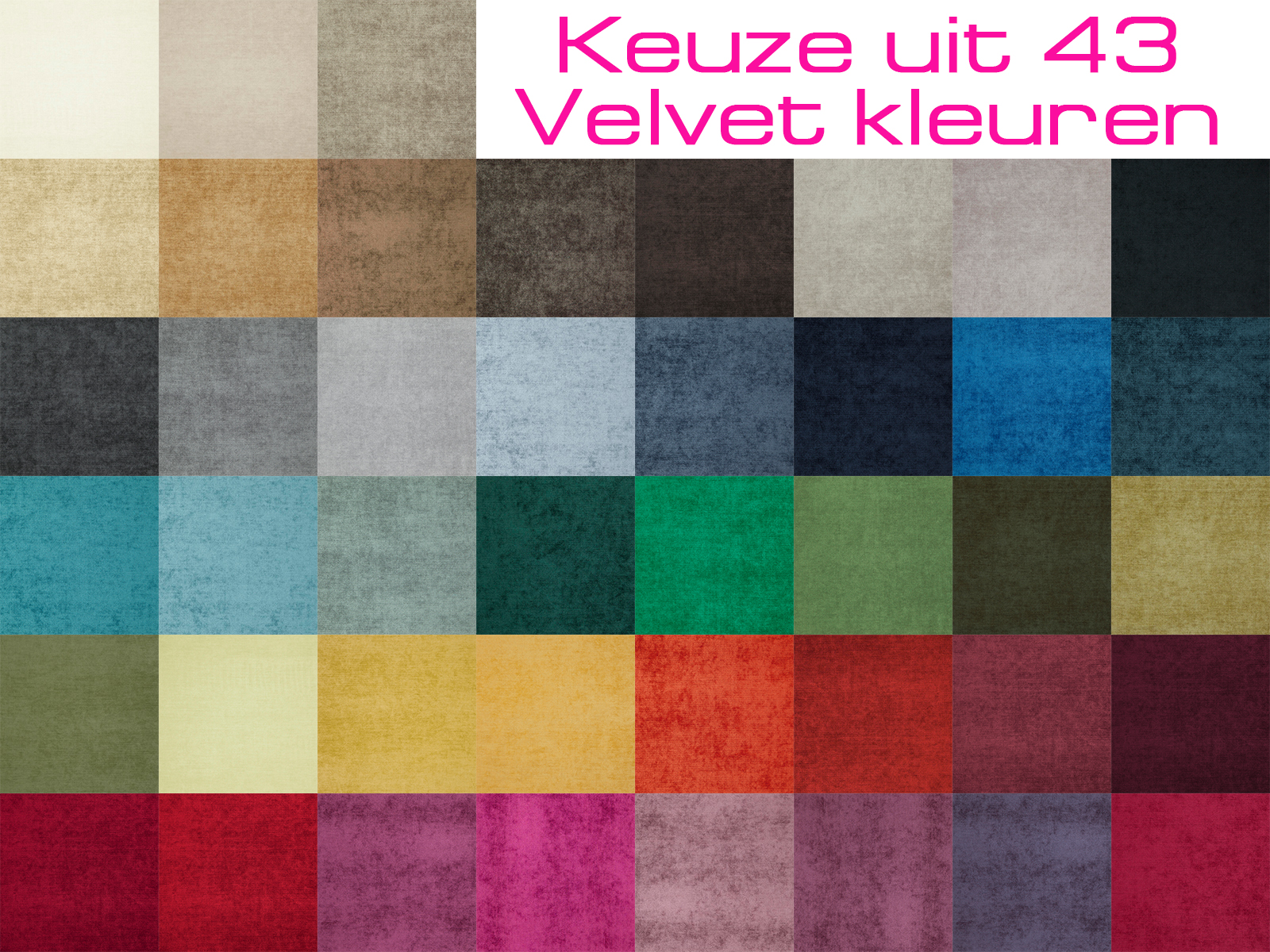 De Velvet serie is beschikbaar in 44 verschillende moderne kleuren. Twijfelt u over de kleur? Bestel dan eerst stofstalen of kom langs in de winkel.